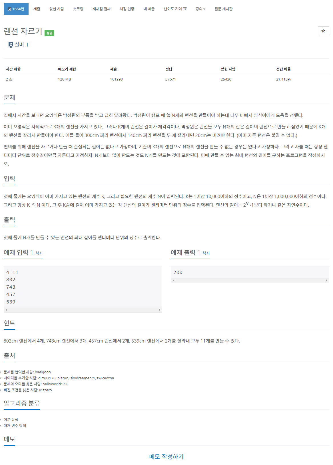 첫째 줄에는 오영식이 이미 가지고 있는 랜선의 개수 K, 그리고 필요한 랜선의 개수 N이 입력된다. K는 1이상 10,000이하의 정수이고, N은 1이상 1,000,000이하의 정수이다. 그리고 항상 K ≦ N 이다. 그
