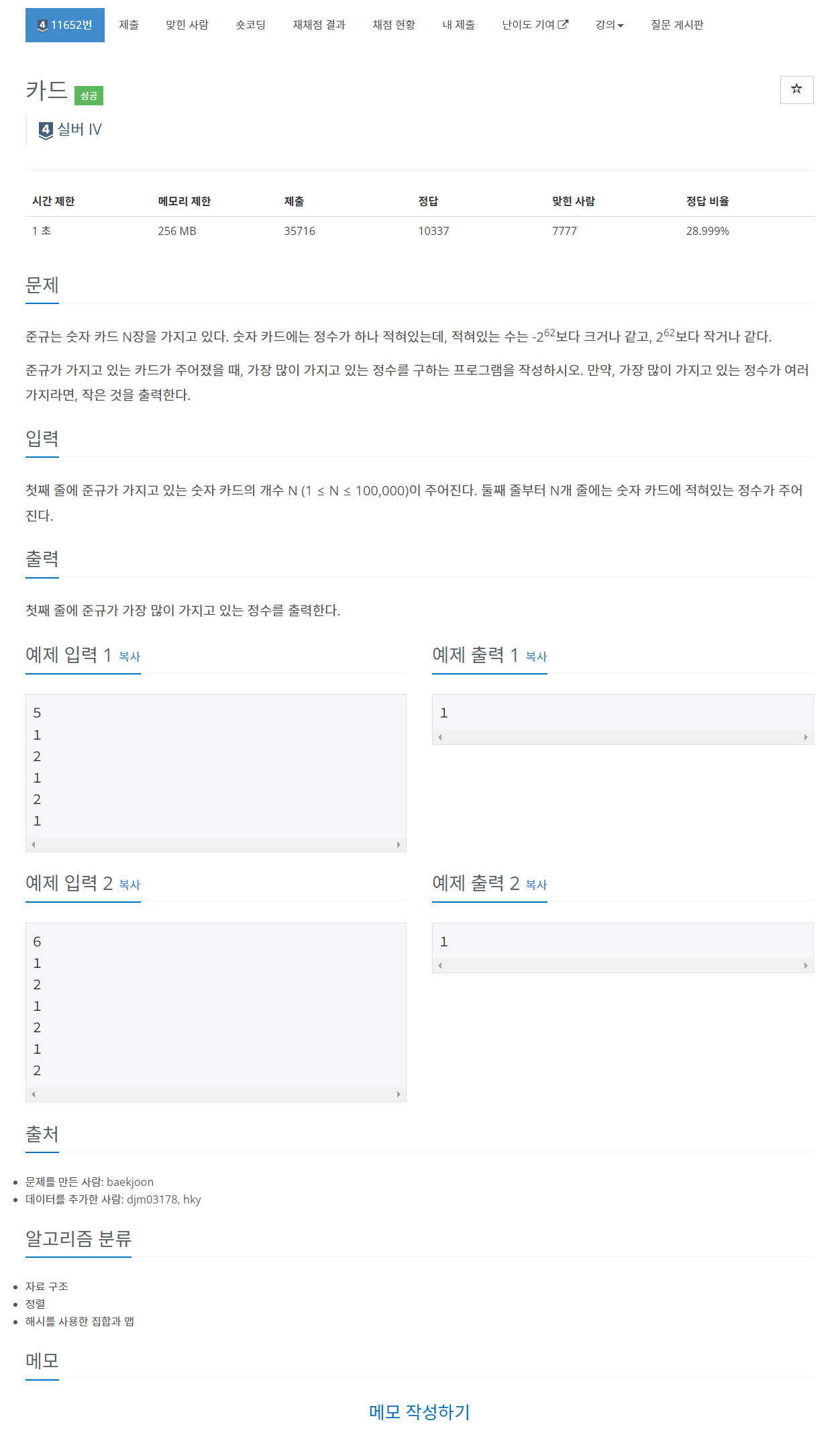 준규는 숫자 카드 N장을 가지고 있다. 숫자 카드에는 정수가 하나 적혀있는데, 적혀있는 수는 -262보다 크거나 같고, 262보다 작거나 같다. 준규가 가지고 있는 카드가 주어졌을 때, 가장 많이 가지