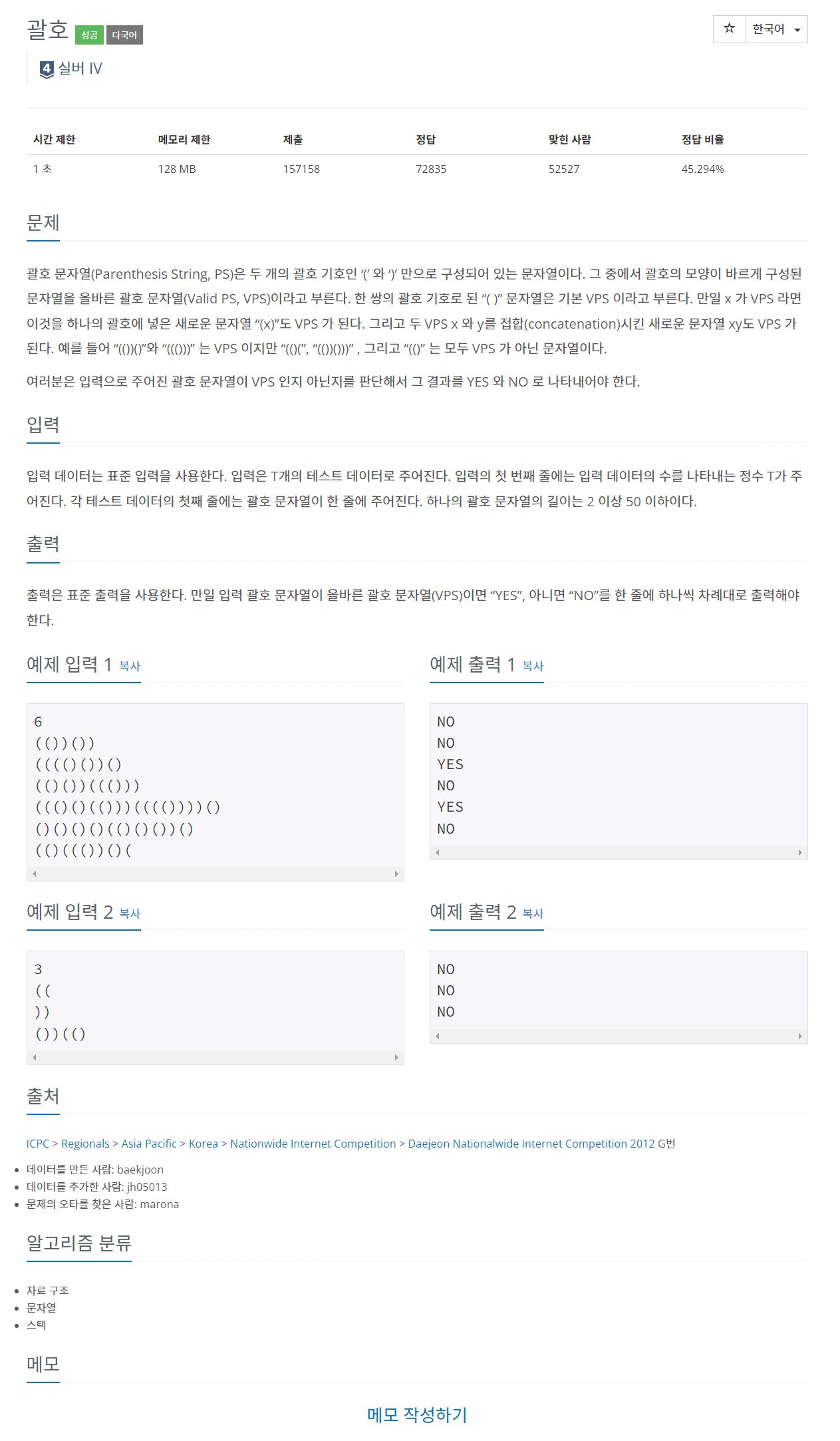괄호 문자열(Parenthesis String, PS)은 두 개의 괄호 기호인 ‘(’ 와 ‘)’ 만으로 구성되어 있는 문자열이다. 그 중에서 괄호의 모양이 바르게 구성된 문자열을 올바른 괄호 문자열(Valid PS, VPS)이라고