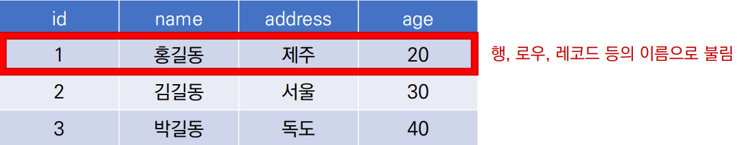 - 행(row) : 실제 데이터가 저장되는 형태