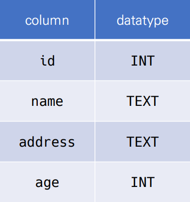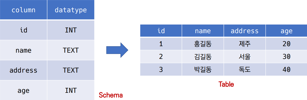 - 열(column) : 각 열에 고유한 데이터 형식 지정