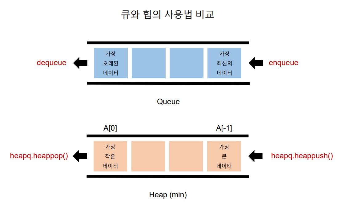 Minheap(최소힙)으로 구현되어 있음(가장 작은 값이 먼저 온다.) 삽입, 삭제, 수정, 조회 연산의 속도가 리스트보다 빠르다. (배열, 연결리스트, 힙으로 구현 가능)